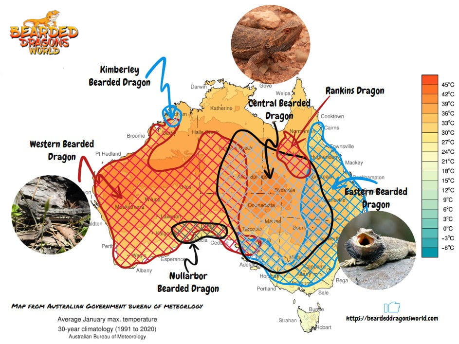 Bearded dragons live in the woodlands, heaths, deserts and coastal dunes, with their range extending throughout the interior of the eastern states to the eastern half of South Australia and southeastern Northern Territory. They are considered to be semiarboreal and quite readily climb and bask at height. This is also linked to dominance behavior and competition for territory/basking areas. They can be found on fallen/broken trees, rocky outcrops, and bushes when basking. Many of the Australian locals have spotted bearded dragons on fence posts and elevated rocky areas. At night, they prefer to dig holes to sleep in, climb in trees, or submerge themselves in rocks and like to climb into the cracks and crevices of stones and caves